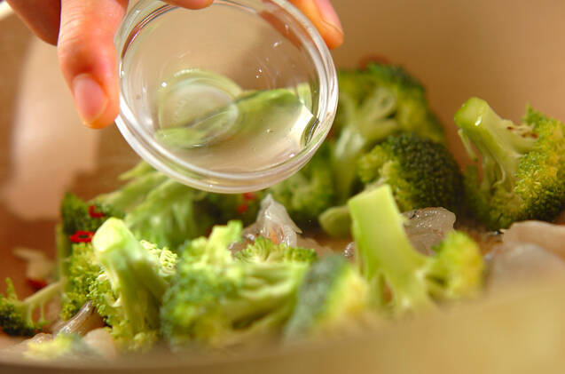 スパゲティーをゆでる間にソースを作る。フライパンにニンニク、オリーブ油を熱し、香りがたったらエビ、ブロッコリー、赤唐辛子、白ワインを入れてフライパンに蓋をし、弱火で蒸し煮にする。(ヒント)ここでスパゲティーがゆで上がっていない場合は、火を止めて下さい。