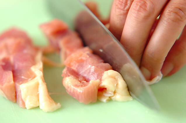 鶏もも肉は食べやすい長さに切り、さらに幅1cmに切る。