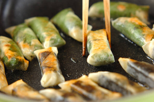フライパンにサラダ油を弱めの中火で熱し、(2)と(3)を両面こんがりとお餅に火が通るまで揚げ焼きにして、器に盛る。