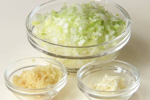 白ネギは縦に4~5本切り込みを入れ、小口から粗いみじん切りにする。