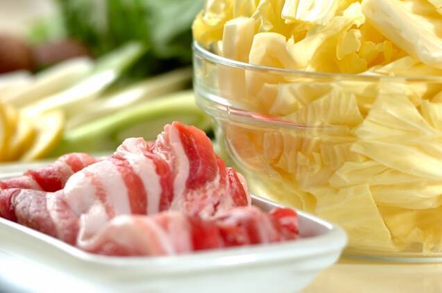 豚バラ肉は大きければ食べやすい大きさに切る。キャベツはザク切りにし、春菊は根元を切り落として食べやすい大きさに切る。
