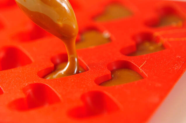 用意したシリコン製のハート型に、(3)を流し入れる。粗熱が取れたら冷蔵庫で冷やし固める。(ヒント)シリコン製の型がない場合は、バット等に流し入れ、固まったら食べやすい大きさに切ってください。