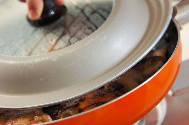 余分な脂をキッチンペーパー等で拭き取り、<つけダレ>を加える。煮たったらフライパンに蓋をして弱火にし、途中で返しながら5~6分蒸し焼きにして火を通す。