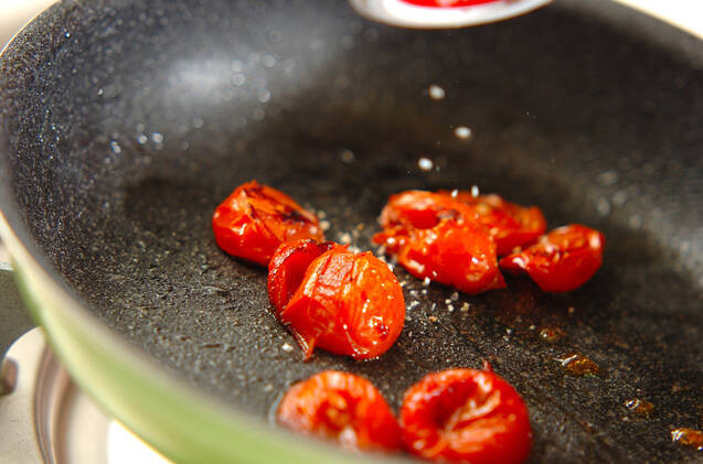 フライパンでEVオリーブ油を熱し、プチトマトを炒める。クタッとなったらハーブソルトを振る。
