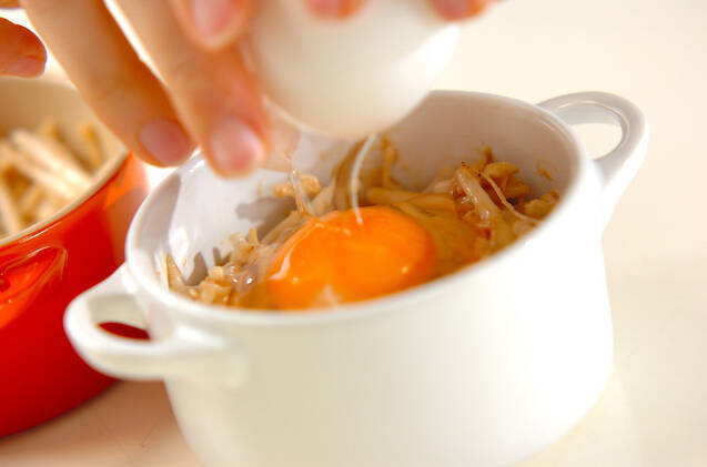 ココット皿に(1)を入れ、卵を1個ずつ割り入れる。トースターで焼き色がつくまで焼き、パプリカパウダーを振る。