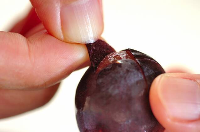 巨峰は房から1粒ずつ外して水洗いし、十字に切り込みを入れ、器に盛る。