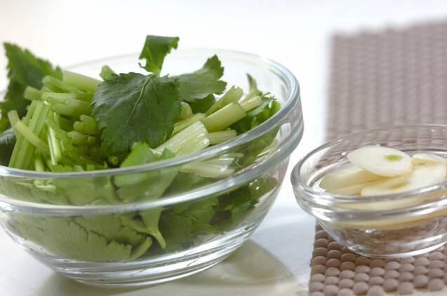 ミツバは根元を切り落とし、粗く刻む。ニンニクは薄い輪切りにする。熱湯に塩を加え、スパゲティーを表示の時間より1分短くゆでる。ゆで汁はお玉1杯分取っておく。