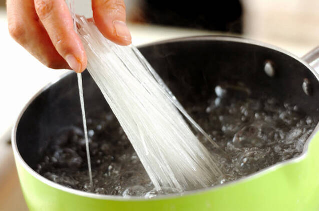 春雨は熱湯に5分つけてもどし、水洗いして水気をきり、食べやすい長さに切る。いろいろなタイプの春雨がありますので、袋の指示に従ってもどして下さい。