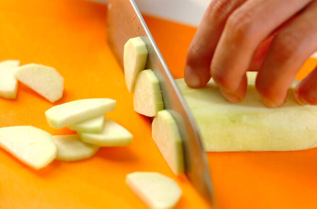 ナスはヘタを切り落として皮をむき、半月切りにして水に放ち、水気をきる。