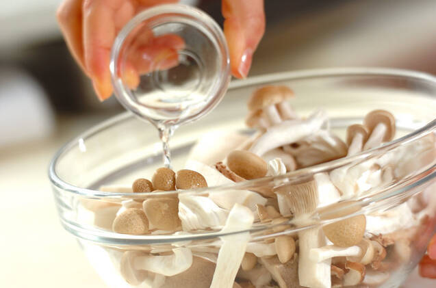 ボウルにキノコを入れ、酒を回しかけてザッと混ぜ合わせる。ラップをして電子レンジで2分加熱し、全体に混ぜ合わせて再び1~2分加熱する。電子レンジは600Wを使用しています。