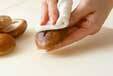 生シイタケは軸を切り落とし、かたく絞ったぬれ布巾で汚れを拭き取る。サッと水洗いした場合はしっかり水気を拭き取って下さい。スライスチーズの場合は1枚を半分に切って半分に折る。