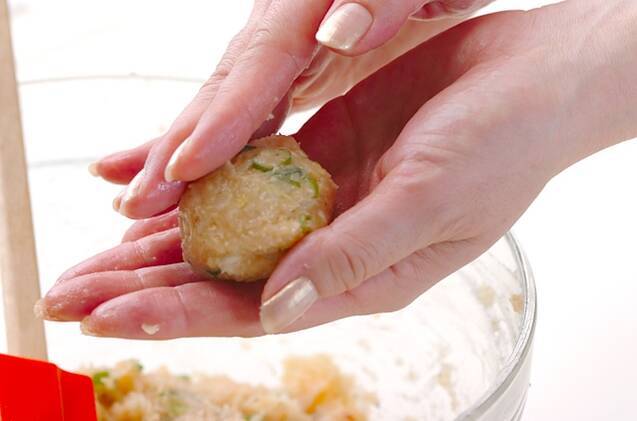 ボウルに<鶏肉団子>の材料を入れてよく練り、12~16個に形を整え、片栗粉を薄くまぶす。