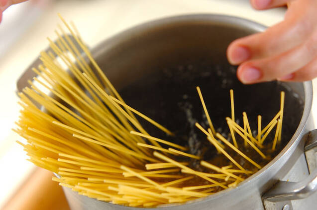 鍋に水と塩を入れて強火にかけ、沸騰したら火を弱めてスパゲティーを茹でる。
