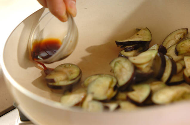 フライパンにサラダ油を強火で熱し、ナスを加えて炒める。全体に炒められたら、塩、粗びき黒コショウを振り、しょうゆを鍋肌からまわしかける。
