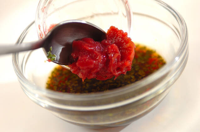 <梅肉ソース>の梅干しは種を取ってペースト状にし、大葉は軸を切り落とし、みじん切りにする。その他の<梅肉ソース>の材料と混ぜ合わせる。