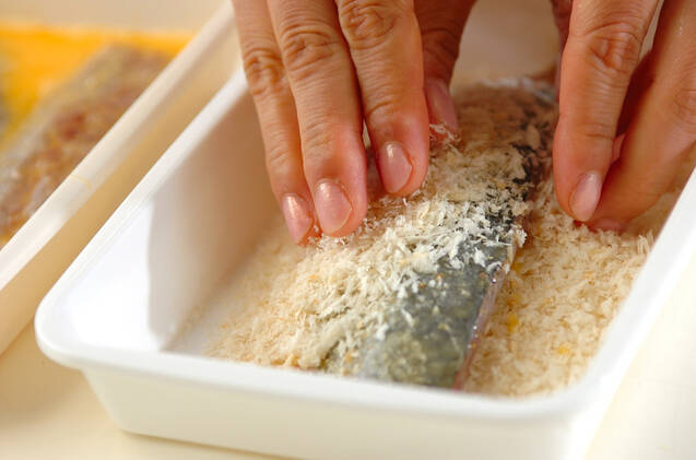 アジに<衣>の小麦粉を薄くつけ、溶き卵、パン粉を順番につける。