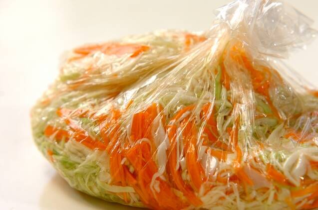 抗菌袋にキャベツ、ニンジン、塩を入れて全体にからめ、できるだけ空気を抜いてしばり、水分がでてくるまで置く。