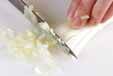 菜の花はサッと水洗いし、1.5cmの長さに切る。<ソース>の白ネギは縦にきりこみを5~6本入れ、みじん切りにする。玉ネギは皮をむき、白ネギに合わせてみじん切りにする。