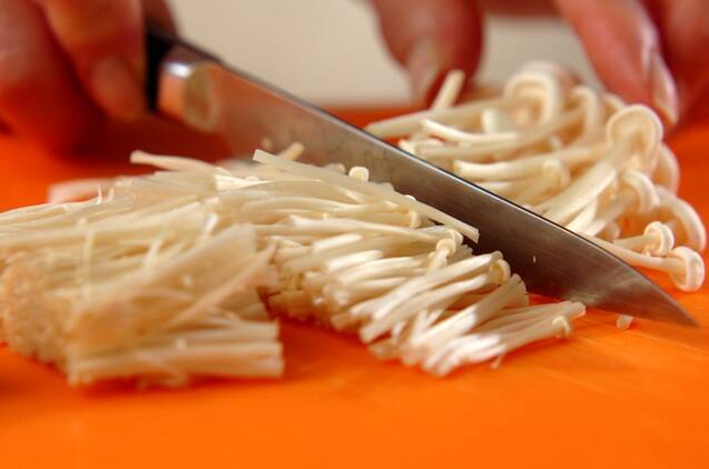 エノキは根元を切り落とし、長さを3等分に切る。根元は食べやすい束にほぐす。