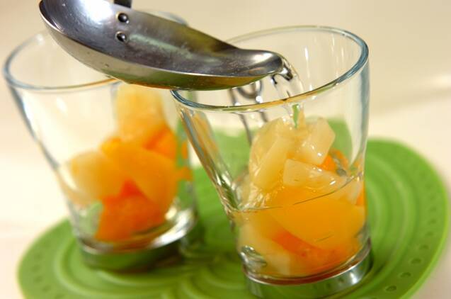 カップにひとくち大に切ったお好みのフルーツを入れて(1)を注ぎ、冷蔵庫で冷やし固め、ミントの葉を添える。