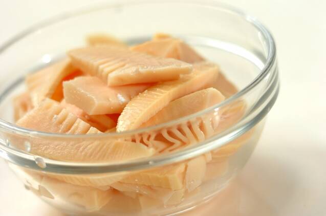 水煮タケノコは厚さ7~8mmの薄切りにする。
