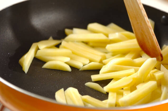 フライパンにサラダ油を入れて強火にかけ、ジャガイモが透き通る位まで炒める。