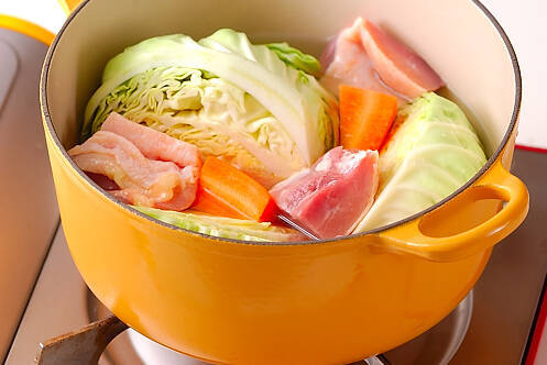 深めの鍋に春キャベツ、ニンジン、鶏もも肉、だし汁を入れて強火にかけ、煮立ったらアクを取る。