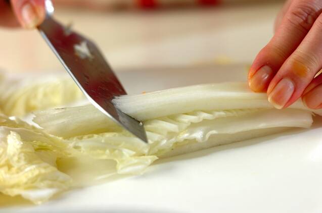 豚バラ肉は食べやすい大きさに切り、塩コショウをする。白菜は食べやすい大きさの削ぎ切りにする。モヤシはサッと水洗いする。