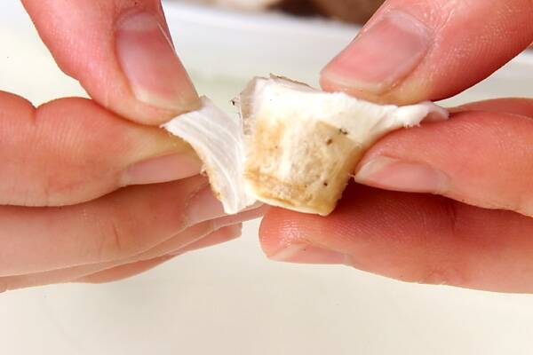 生シイタケは汚れを拭き取り、石づきを切り落として軸と笠に分け、軸は縦に裂き、笠は4等分に切る。