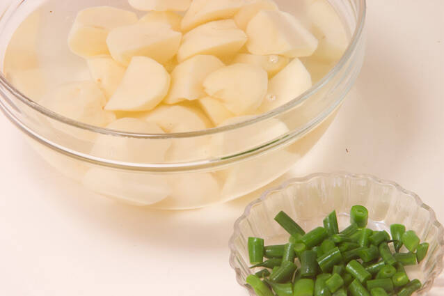 ジャガイモは皮をむき、少し大きめの一口大に切り、水に放つ。