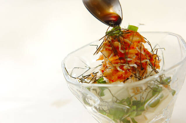 器に豆腐を盛り、白菜キムチ、刻みのり、刻みネギをのせ、<合わせダレ>をかける。