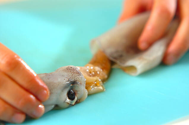 イカは胴と足がくっついている所を指で引っ張ってはずし、足を持って胴から引き抜く。胴は水洗いして軟骨を抜き取り、幅1cmの輪切りにする。足は目の際で切り落としてくちばしを取り、足先を切り揃える。吸盤は包丁でこそげ落とし、2本ずつに切り分ける。