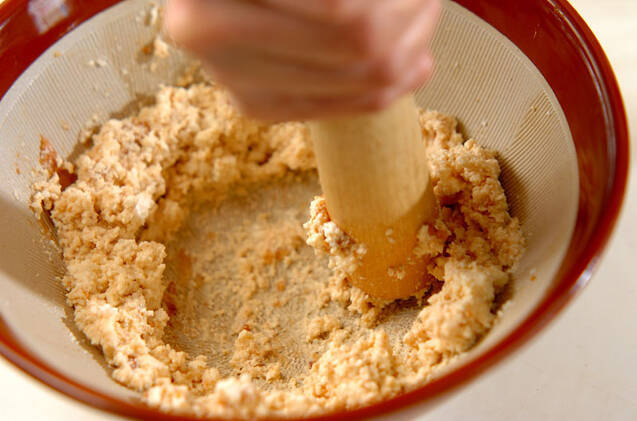 <和え衣>の材料をすり鉢に入れ、すりこ木でよくすり混ぜる。
