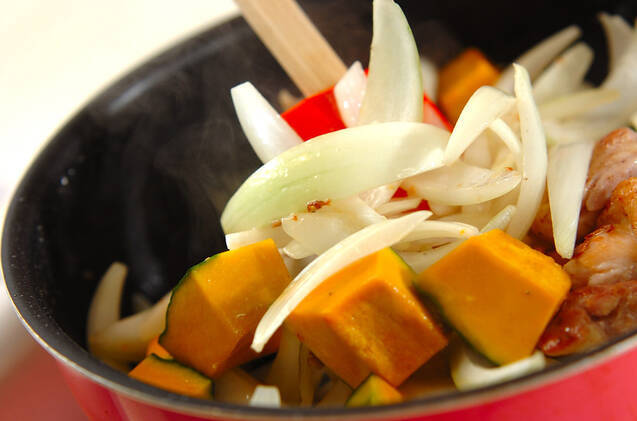 鶏もも肉の色が変わったらカボチャ、玉ネギを加えて炒め合わせる。