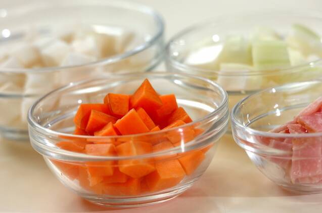 ベーコンは1cm角に切る。玉ネギは1cmの角切りにする。カブとニンジンは皮が付いたまま、1cm角の角切りにする。