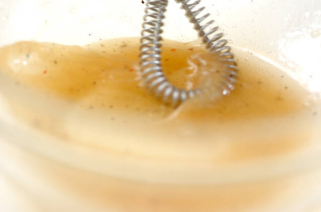 ボウルに<ドレッシング>の材料を入れ、乳化するまでよく混ぜ合わせる。レンコン、菜の花の水気をきる。