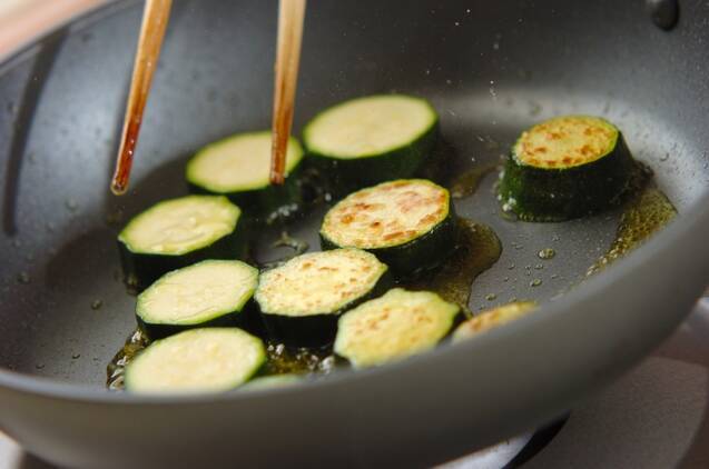 フライパンにオリーブ油を熱し、ズッキーニを入れ、両面に焼き色がつくまで焼く。