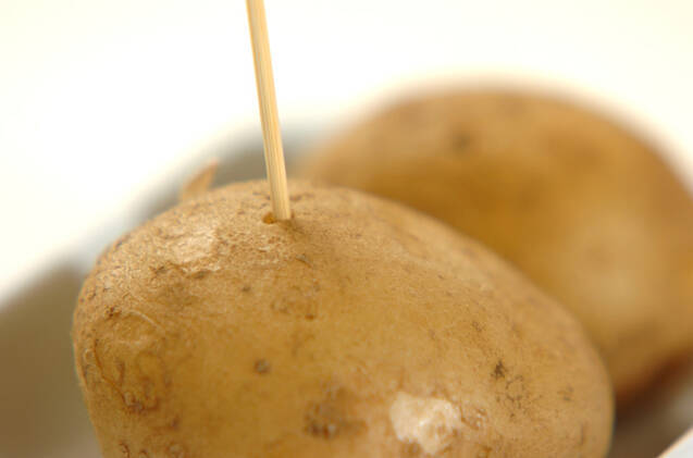 ジャガイモは皮ごときれいに水洗いし、1個ずつラップに包んで電子レンジで6~7分加熱する。竹串を刺してスッと刺さればOK、かたければもう少し加熱して下さい。(ヒント)電子レンジは600Wを使用しています。