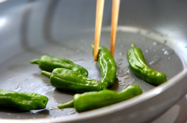 フライパンにサラダ油を薄くひき、シシトウを炒めて取り出し、塩コショウを振る。