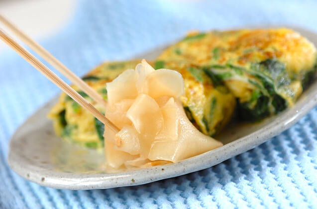 周りが固まって半熟になったら向こうから手前に巻き、同じ様にもう1度くり返し、巻きすに巻いて形を整える。粗熱が取れたら、食べやすい大きさに切って器に盛り、甘酢ショウガを添える。