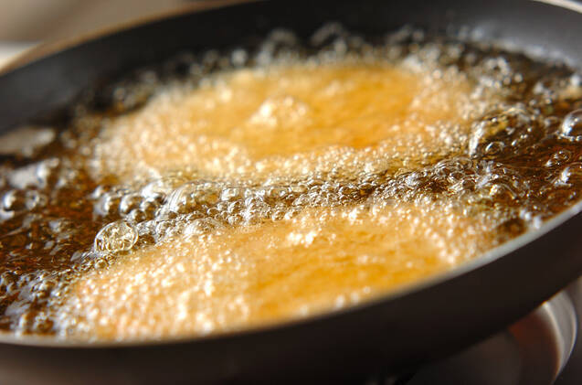 170℃の揚げ油に(1)を入れ、揚げ色がつくまで揚げ、しっかり油をきる。サラダ菜をしいた器に盛る。