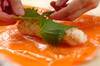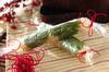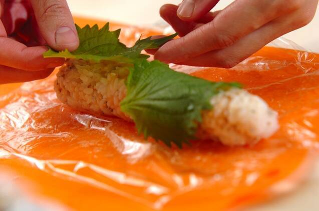 ラップで1/2量を包んでしっかりと握り、スティック型に整える。ラップを開き、根元を切り落とした大葉を2枚並べ、もう一度ラップで握る。同じものをもう1つ作る。