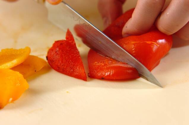 パプリカは皮をむき、種とヘタを取り除いて食べやすい大きさに切る。