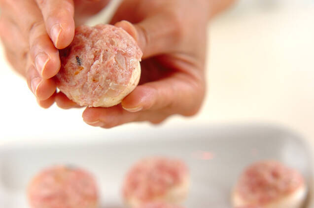 手にサラダを薄くぬり、7~8等分にする。マッシュルームの内側に薄く小麦粉を振り、<ミートボールダネ>を詰め、全体に小麦粉をからめる。