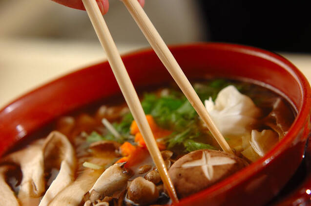 土鍋に<合わせだし>を入れ、煮たったらお好みの具を入れ、火の通った物からだし汁と一緒に取り鉢に取り、お好みで刻みネギ、柑橘汁、一味唐辛子を加える。