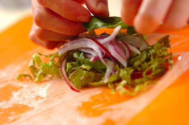 トマト(1枚分)を横向きに並べ、生ハム、サニーレタス、バジル1枚を半分にちぎってのせ、バジルの間に紫玉ネギをのせて巻きこむ。
