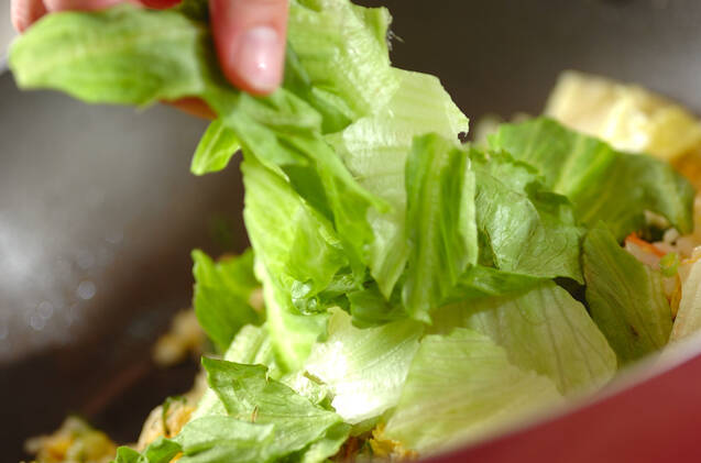 中華スープの素、塩コショウ、ネギ、 カニ風味カマボコを加えて炒める。最後に、しょうゆとレタスを加えて混ぜ合わせ、火を止めて器に盛る。