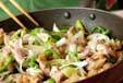 白ネギ、ピーマンを加えて炒めあわせ、全体にしんなりすれば、塩コショウで味を整える。