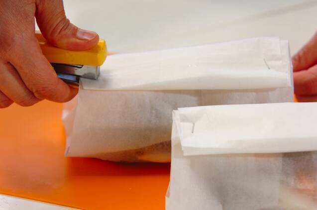 オーブンシートに半量の白ネギ、マイタケ、シメジ、タラ、ニンジンの順にのせて酒をかけ、バターをのせてふんわり包む(2個作る)。