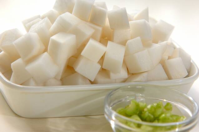 大根は皮をむき、1~1.5cm角に切る。大根葉は水洗いして細かく刻む。<調味料>の材料を混ぜ合わせる。